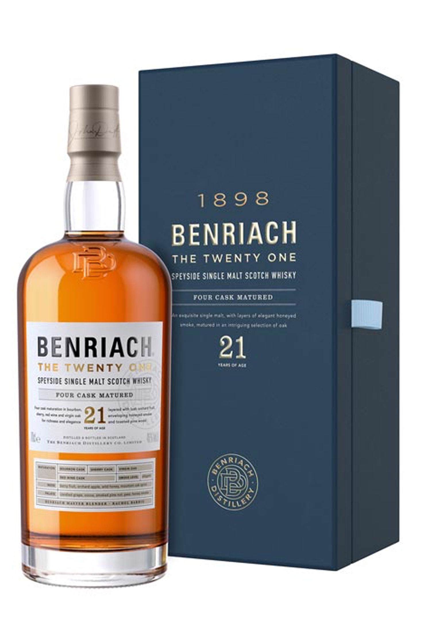 Denne specielle aftapning fra Benriach er en kombination af røget og ikke-røget whisky, der er modnet i minimum 21 år på hele fire forskellige fadtyper. Først og fremmest whisky, der er lagret på Sherry- og Bourbonfade, men også whisky der er er lagret på Virgin Oak og vinfade. Den endelige komposition har givet en absolut elegant Benriach single malt med masser af forskellige aromalag, spændende fra frugtagtige toner til tungere og mere røgede elementer.