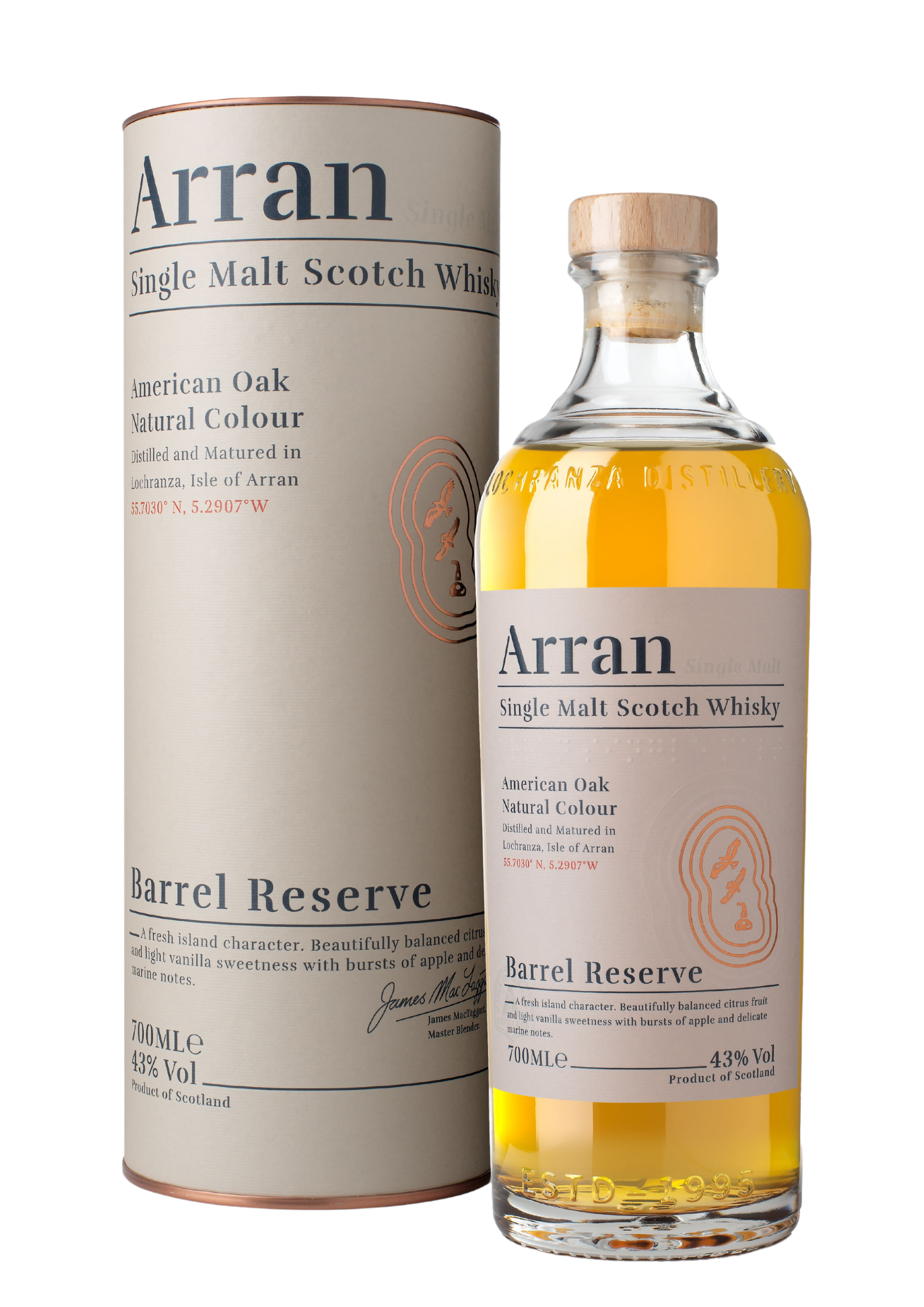 Arran Barrel Reserve Single Malt er en fremragende, frisk og elegant Single Malt og Single Barrel skotsk whisky uden alder, der med lækre og sødlige frugtnoter repræsentere sin oprindelse og destilleriets traditioner.